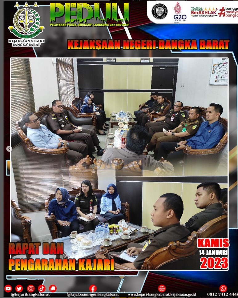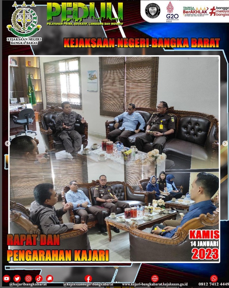 Kamis, 12 Januari 2023, Kepala Kejaksaan Negeri Bangka Barat menggelar rapat bersama para Kepala Seksi, Kasubbagbin, Kasubsi dan Jaksa Fungsional serta memberikan pengarahan mengenai program kerja tahun 2023 serta peningkatan pelayanan prima kepada masyarakat.