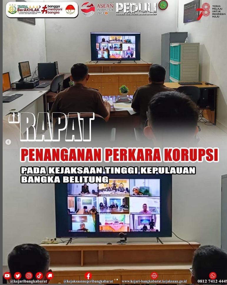 Senin, 7 Agustus 2023, Kepala Kejaksaan Negeri Bangka Barat didampingi oleh Kepala Seksi Pengelolaan Barang Bukti dan Barang Rampasan serta pegawai, secara virtual menghadiri rapat tentang penanganan perkara korupsi pada Kejaksaan Tinggi Kepulauan Bangka Belitung Tahun Anggaran 2023