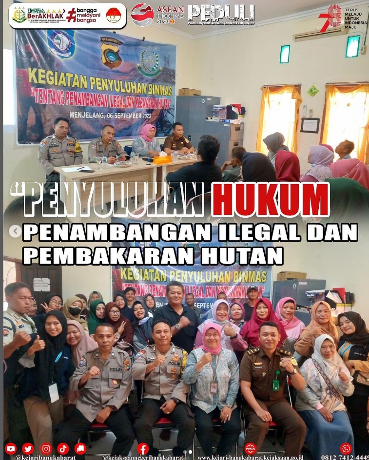 Rabu, 6 September 2023, Jaksa Fungsional Kejaksaan Negeri Bangka Barat bertindak sebagai narasumber dalam kegiatan penyuluhan hukum tentang penambangan ilegal dan pembakaran hutan yang bertempat di kantor kelurahan menjelang Mentok Bangka Barat