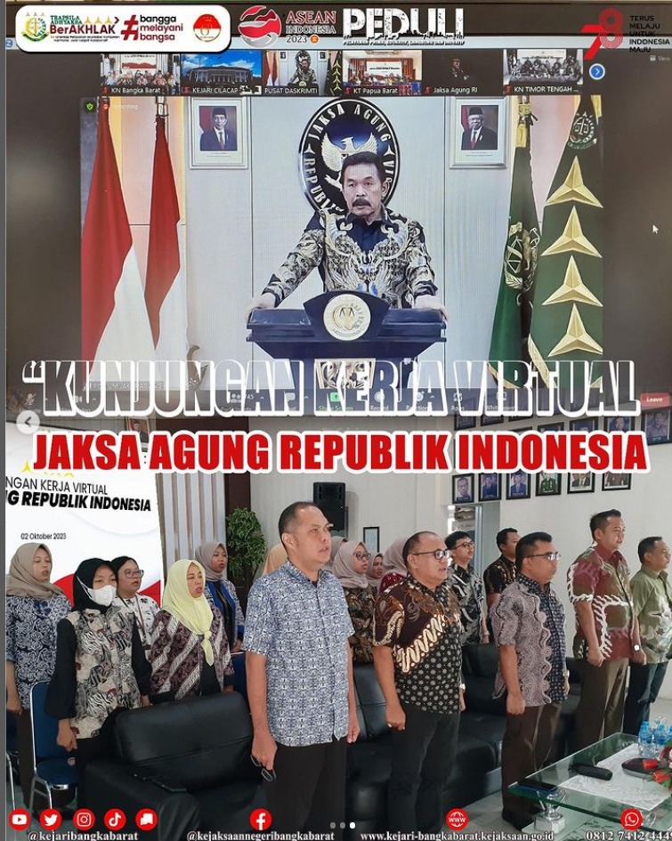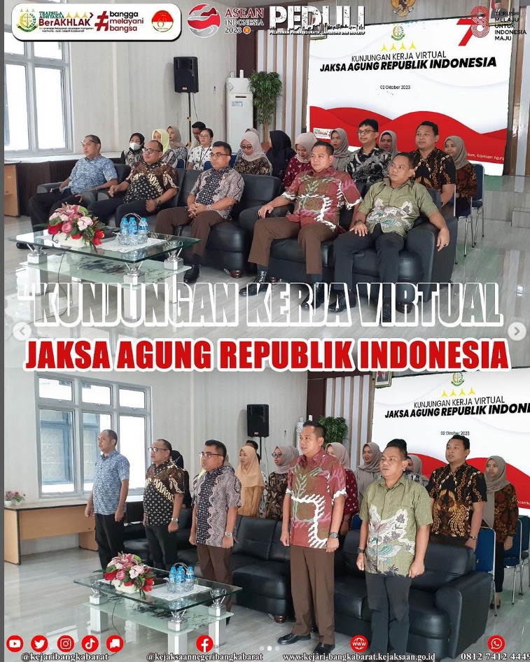 Senin, 2 Oktober 2023, Kepala Kejaksaan Negeri Bangka Barat bersama para Kepala Seksi, Kasubbagbin, Jaksa Fungsional dan Pegawai mengikuti kegiatan Kunjungan Kerja Virtual Jaksa Agung Republik Indonesia dalam rangka Konsolidasi dan Peningkatan Kinerja
