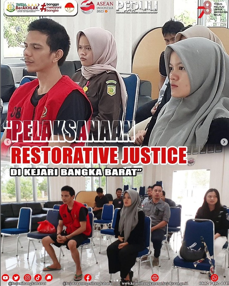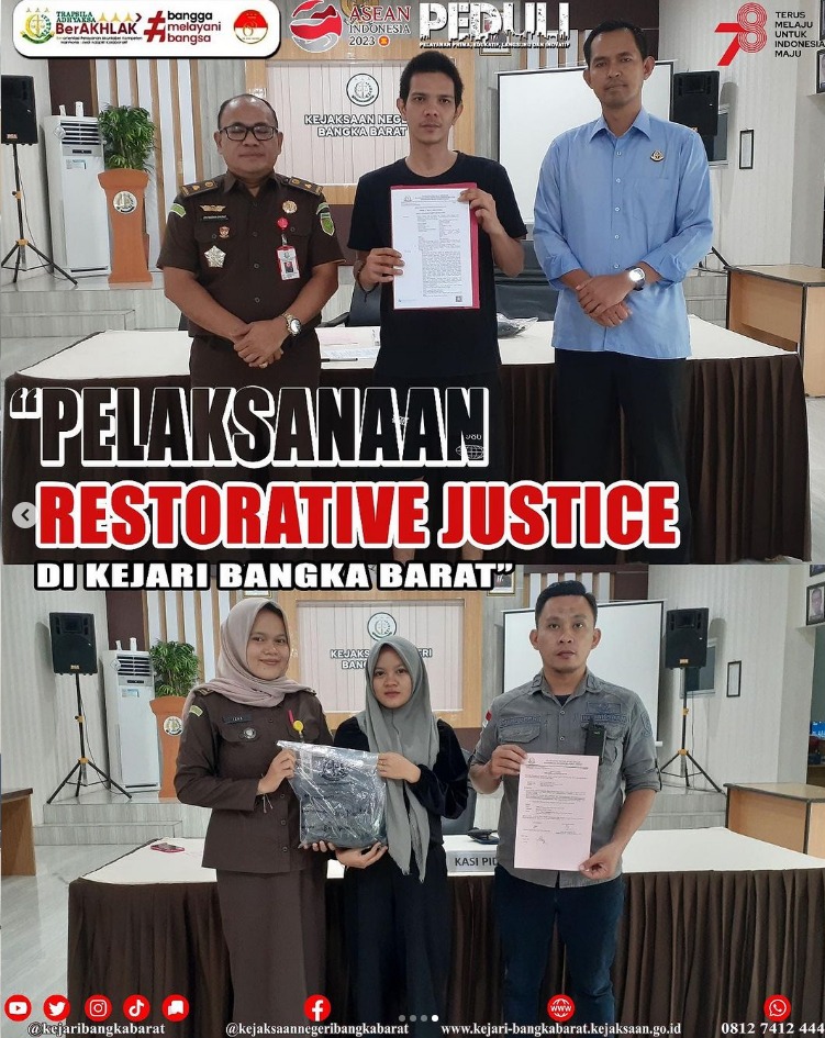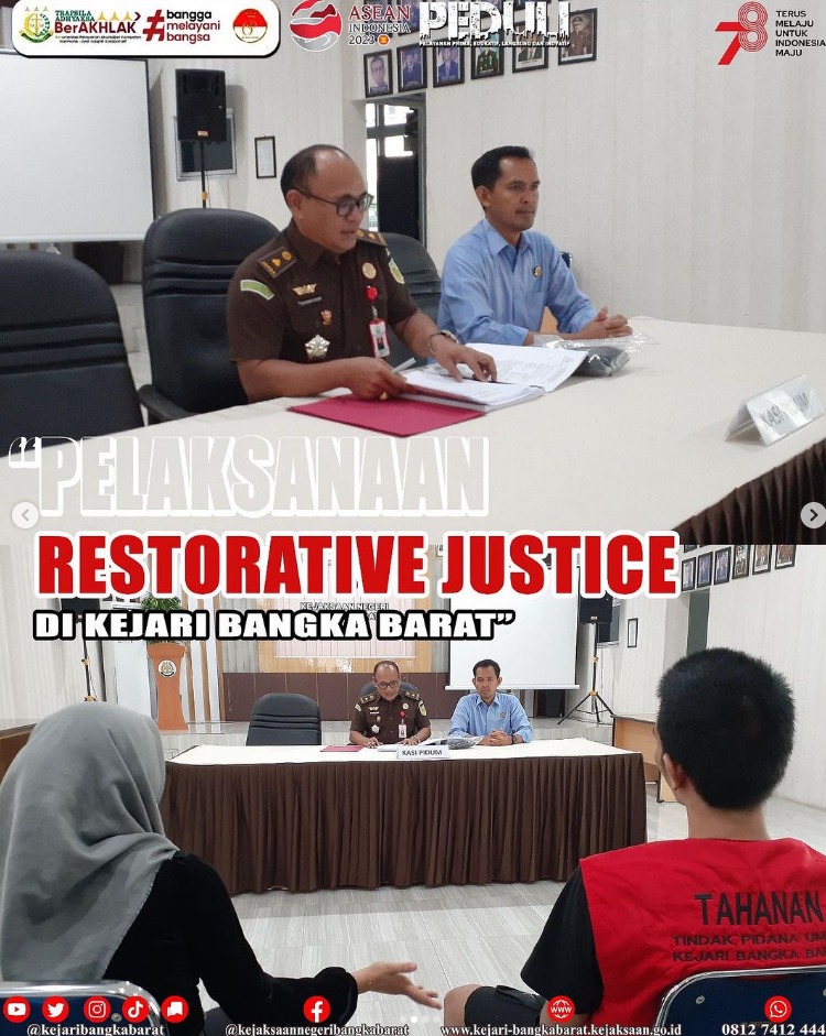 Kamis, 19 Oktober 2023, Kepala Seksi Tindak Pidana Umum Kejaksaan Negeri Bangka Barat didampingi oleh Kepala Seksi Pengelolaan Barang Bukti Dan Barang Rampasan melaksanakan proses Restorative Justice terhadap saudara SM Alias S bin AA yang disangkakan melanggar pasal 44 ayat (1) UU No 23 Th 2004 Tentang Penghapusan KDRT dan pasal 351 ayat (1) KUHP. Pengajuan Restorative Justice ini pada akhirnya mendapat persetujuan dari Jaksa Agung Muda Pidana Umum Kejaksaan RI melalui Plt Dir TP. OHARDA Kejaksaan RI
