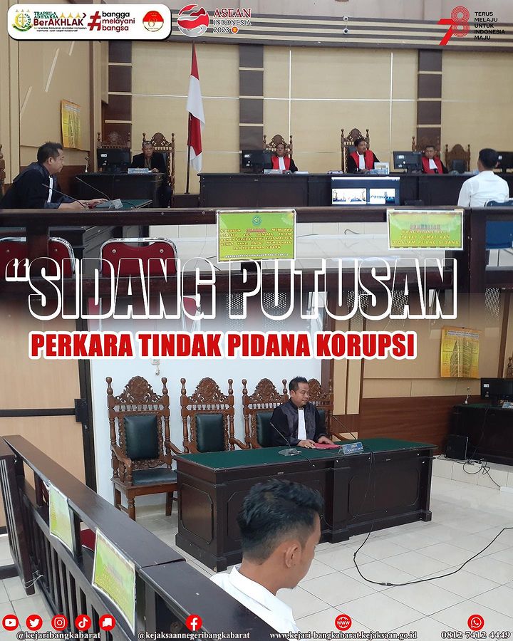 Kamis, 9 November 2023, Telah dilaksanakan sidang perkara Tipikor dengan agenda pembacaan putusan oleh majelis hakim atas nama terdakwa EJ alias E bin JA. dalam putusannya, majelis hakim memberikan vonis kepada terdakwa 4 tahun 6 bulan kurungan dan denda 200jt rupiah atau 4 bulan kurungan. Terdakwa terbukti bersalah dalam perkara tindak pidana korupsi dalam pengelolaan dana Rumah Sakit Umum Daerah Sejiran Setason (RSUD SS) Kabupaten Bangka Barat yang bersumber dari dana Badan Layanan Umum Daerah (BLUD) tahun 2017 yang merugikan keuangan neggara sebesar Rp 750.416.398,00