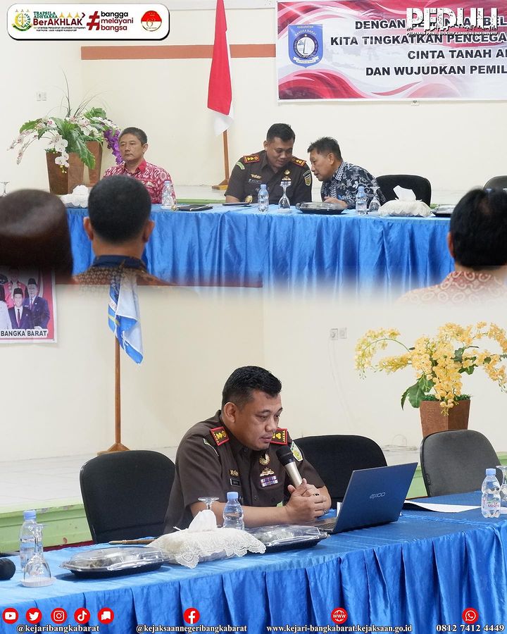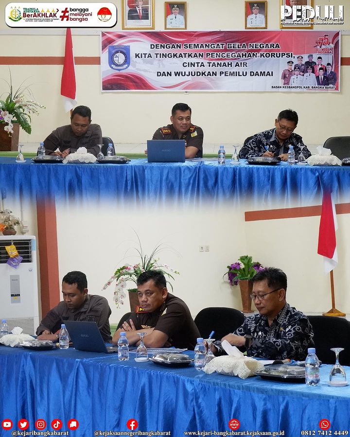 Kamis, 21 Desember 2023, Kepala Kejaksaan Negeri Bangka Barat bertindak sebagai Narasumber dalam kegiatan Sosialisasi Upaya Pencegahan Dan Pemberantasan Tindak Pidana Korupsi dengan tema “Dengan Semangat Bela Negara, Kita Tingkatkan Pencegahan Korupsi, Cinta Tanah Air Dan Wujudkan Pemilu Damai”. Kegiatan yang dihadiri oleh Sekda dan Kepala OPD serta dari pihak kecamatan dan Desa di Bangka Barat ini bertempat di Ruang Batu Rakit Pemkab Bangka Barat.