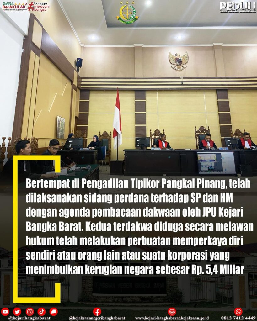Selasa, 30 Januari 2024 bertempat di Pengadilan Tipikor pangkal Pinang, telah dilaksanakan sidang perdana terhadap saudara SP dan HM yang didakwa melakukan tindak pidana korupsi penyalahgunaan penataan aset dalam pelaksanaan pengembangan permukiman Transmigran di Desa Jebus Kabupaten Bangka Barat tahun 2021, Dalam Dakwaannya Jaksa Penuntut Umum Mendakwa SP dan HM Melanggar Pasal 2 ayat (1) Jo Pasal 18 Undang-Undang Nomor 31 Tahun 1999 Tentang Pemberantasan Tindak Pidana Korupsi sebagaimana telah diubah dengan Undang-Undang Nomor 20 Tahun 2001 Tentang Perubahan Atas Undang-Undang Nomor 31 Tahun 1999 Tentang Pemberantasan Tindak Pidana Korupsi Jo Pasal 55 ayat (1) ke-1 KUHP Subsidiair Pasal 3 Jo Pasal 18 Undang-Undang Nomor 31 Tahun 1999 Tentang Pemberantasan Tindak Pidana Korupsi sebagaimana telah diubah dengan Undang-Undang Nomor 20 Tahun 2001 Tentang Perubahan Atas Undang-Undang Nomor 31 Tahun 1999 Tentang Pemberantasan Tindak Pidana Korupsi Jo Pasal 55 ayat (1) ke-1 KUHP mengakibatkan Kerugian keuangan sebesar Rp. 5.468.860.000,00 (lima milyar empat ratus enam puluh delapan juta delapan ratus enam puluh ribu rupiah)