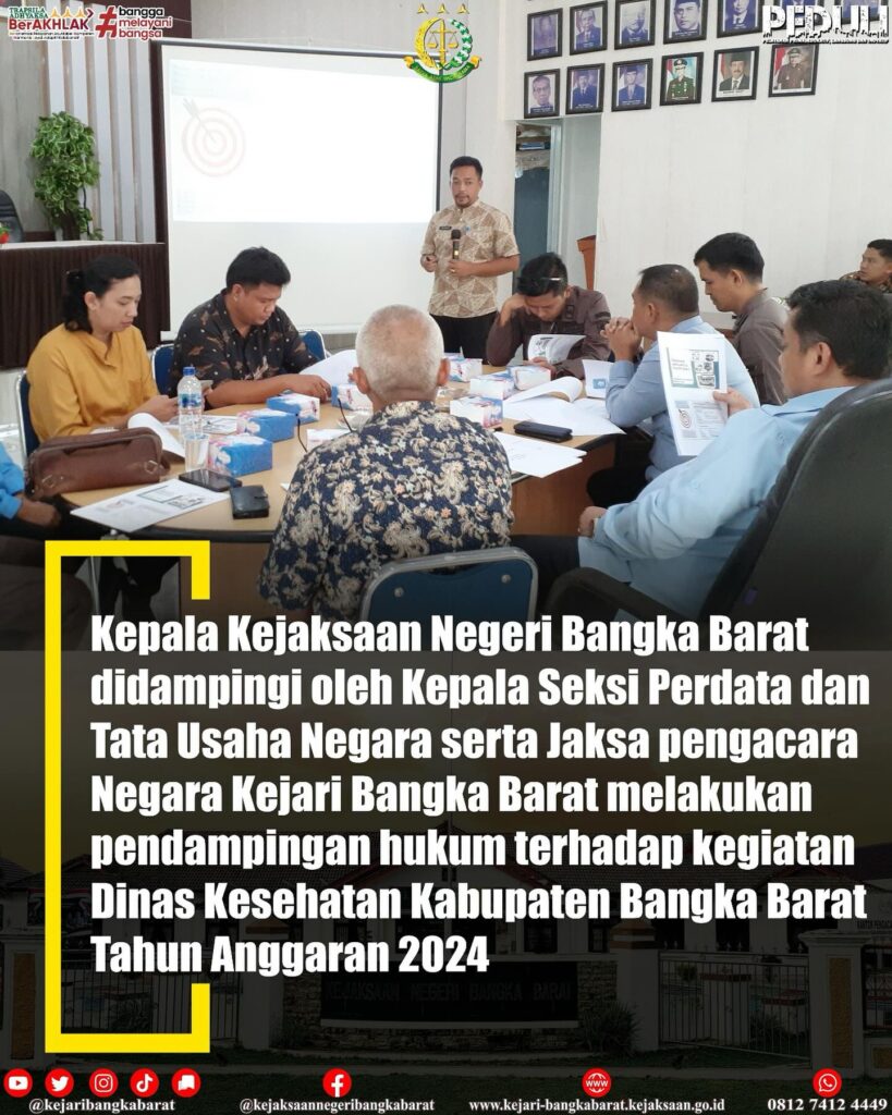 Kamis, 1 Februari 2024, Kepala Kejaksaan Negeri Bangka Barat didampingi oleh Kepala Seksi Perdata dan Tata Usaha Negara serta Jaksa pengacara Negara Kejari Bangka Barat melakukan pendampingan hukum terhadap kegiatan Dinas Kesehatan Kabupaten Bangka Barat Tahun Anggaran 2024 yang bertempat di Aula Adhyaksa Kejari Bangka Barat