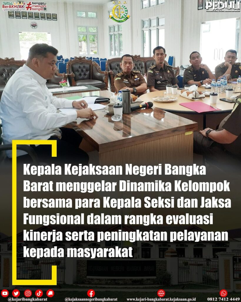 Berita Dinamika Kelompok 0 Rabu, 7 Februari 2024, Kepala Kejaksaan Negeri Bangka Barat menggelar Dinamika Kelompok bersama para Kepala Seksi dan Jaksa Fungsional dalam rangka evaluasi kinerja serta peningkatan pelayanan kepada masyarakat Continue Reading Previous Pengarahan Kepala Kejaksaan Negeri Bangka BaratNext Apel Kesiapan Kerja Leave a Reply Cancel replyYour email address will not be published. Required fields are marked *Comment * Name * Email * Website Save my name, email, and website in this browser for the next time I comment.
