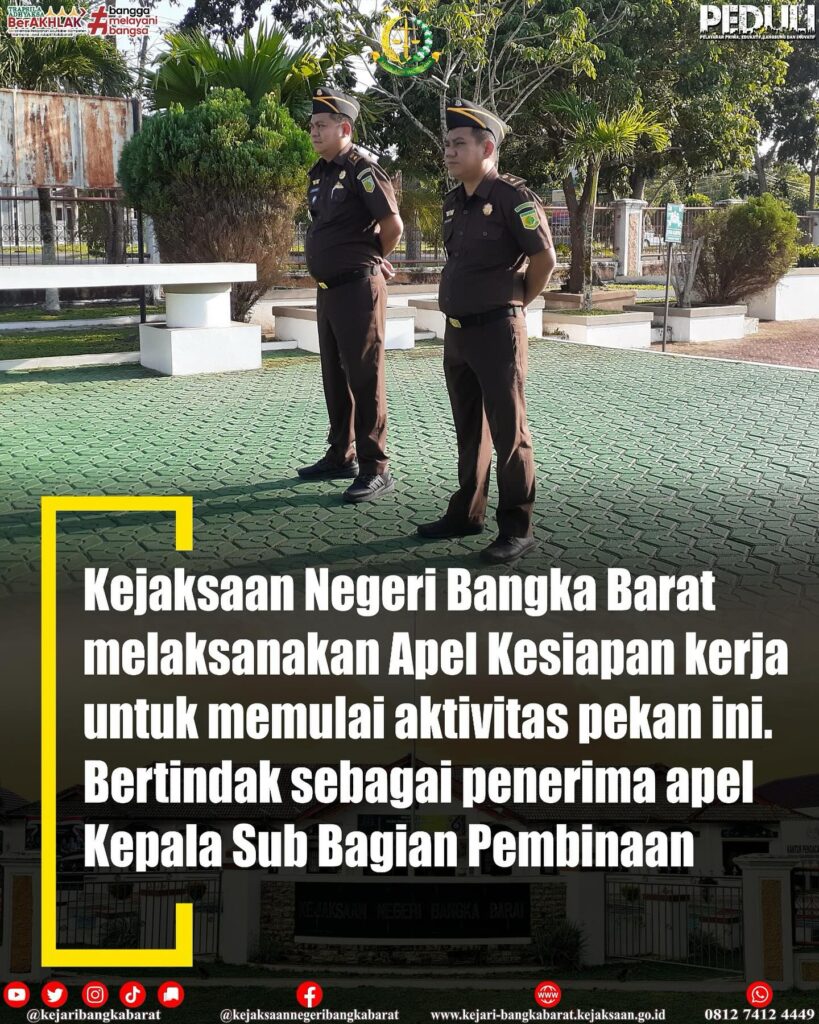 Berita Apel Kesiapan Kerja 0 Senin, 19 Februari 2024, Kejaksaan Negeri Bangka Barat melaksanakan Apel Kesiapan kerja untuk memulai aktivitas pekan ini. Bertindak sebagai penerima apel Kepala Sub Bagian Pembinaan Continue Reading Previous Dinamika KelompokNext Inspeksi Umum oleh Inspektur IV pada Jaksa Agung Muda Bidang Pengawasan Kejaksaan RI Leave a Reply Cancel replyYour email address will not be published. Required fields are marked *Comment * Name * Email * Website Save my name, email, and website in this browser for the next time I comment.