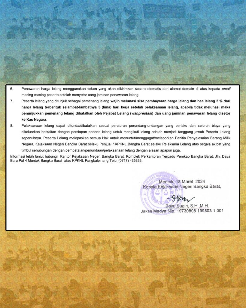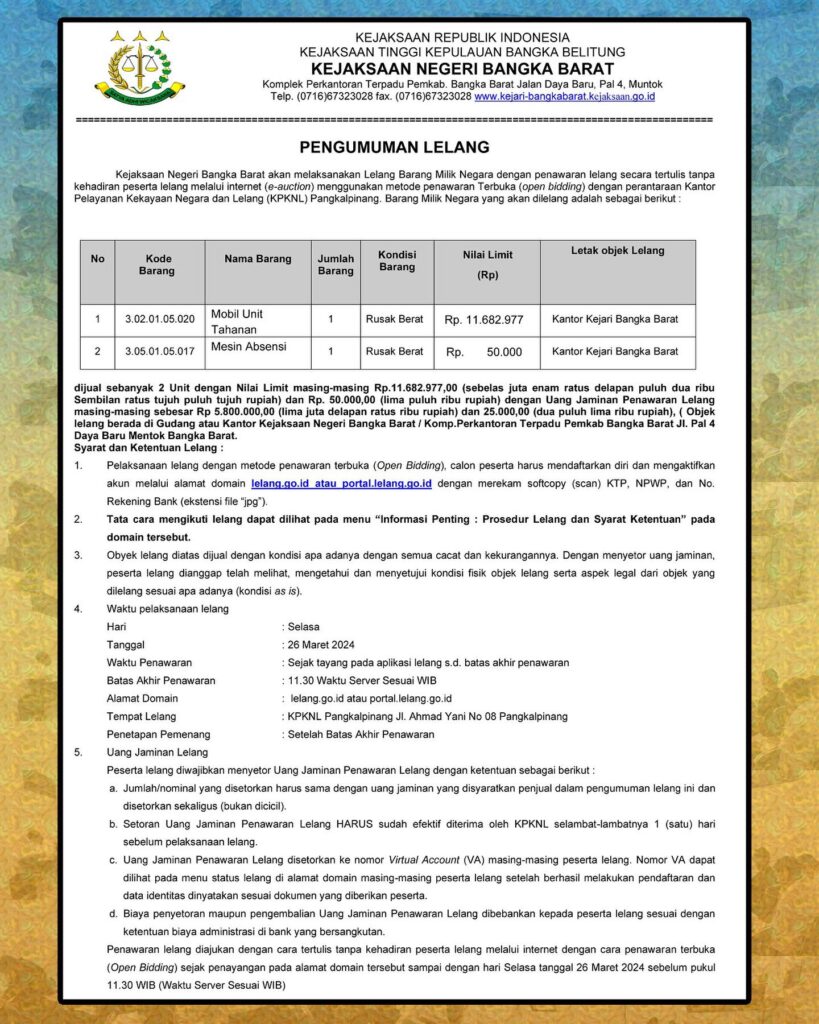 Uncategorized Pengumuman Lelang BMN 0 Continue Reading Previous PENGUMUMAN HASIL SELEKSI ADMINISTRASI PENERIMAAN PEGAWAI PEMERINTAH NON PEGAWAI NEGERI (PPNPN) KEJAKSAN NEGERI BANGKA BARAT TA 2024Next INSPEKSI KHUSUS INSPEKTORAT KEUANGAN JAMWAS PADA KEJAKSAAN TINGGI KEP. BANGKA BELITUNG Leave a Reply Cancel replyYour email address will not be published. Required fields are marked *Comment * Name * Email * Website Save my name, email, and website in this browser for the next time I comment.