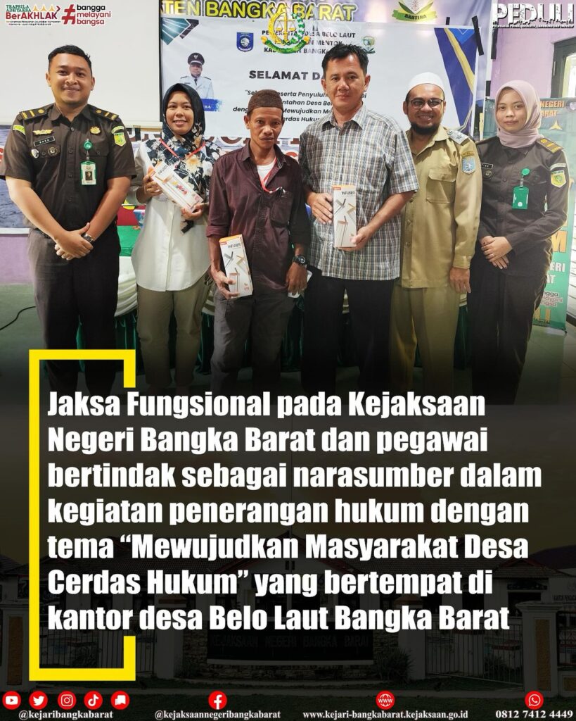 Selasa, 30 April 2024, Jaksa Fungsional pada Kejaksaan Negeri Bangka Barat dan pegawai bertindak sebagai narasumber dalam kegiatan penerangan hukum dengan tema “Mewujudkan Masyarakat Desa Cerdas Hukum” yang bertempat di kantor desa Belo Laut Bangka Barat