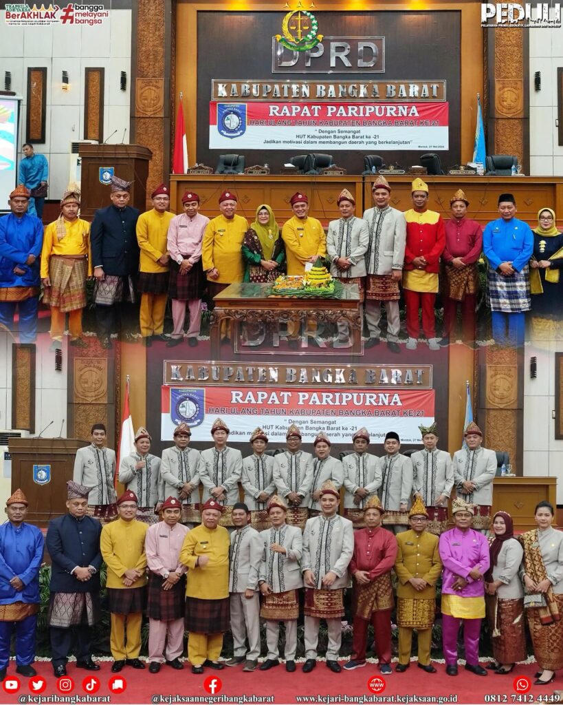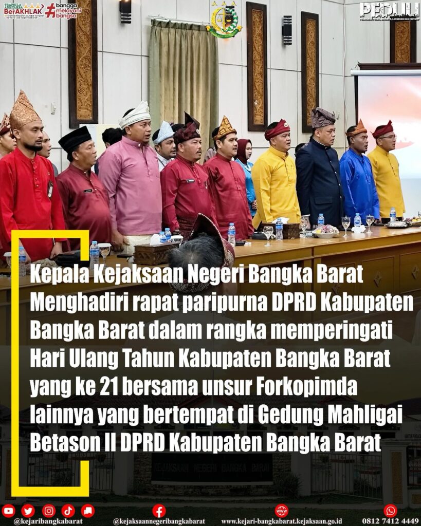 Senin, 27 Mei 0224, Kepala Kejaksaan Negeri Bangka Barat Menghadiri rapat paripurna DPRD Kabupaten Bangka Barat dalam rangka memperingati Hari Ulang Tahun Kabupaten Bangka Barat yang ke 21 bersama unsur Forkopimda lainnya yang bertempat di Gedung Mahligai Betason II DPRD Kabupaten Bangka Barat