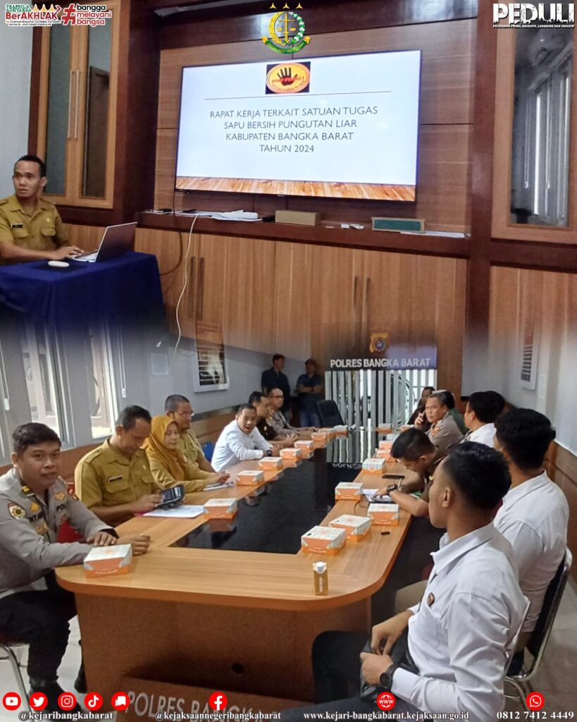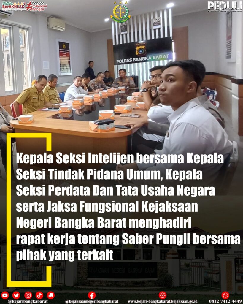 Senin, 3 Juni 2024, Kepala Seksi Intelijen bersama Kepala Seksi Tindak Pidana Umum, Kepala Seksi Perdata Dan Tata Usaha Negara serta Jaksa Fungsional Kejaksaan Negeri Bangka Barat menghadiri rapat kerja tentang Saber Pungli bersama pihak yang terkait yang bertempat di Mapolres Bangka Barat