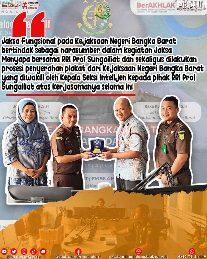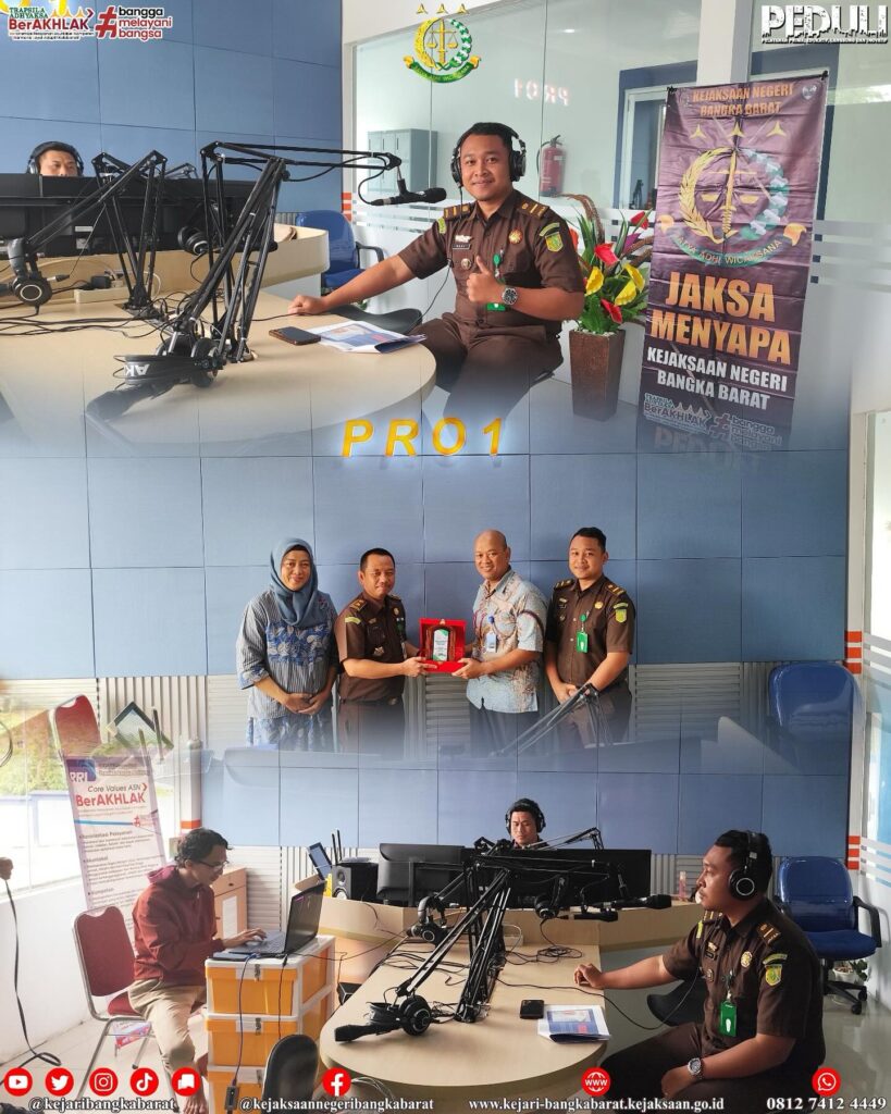 Kamis, 4 Juli 2024, Jaksa Fungsional pada Kejaksaan Negeri Bangka Barat bertindak sebagai narasumber dalam kegiatan Jaksa Menyapa bersama RRI Pro1 Sungailiat dan sekaligus dilakukan prosesi penyerahan plakat dari Kejaksaan Negeri Bangka Barat yang diwakili oleh Kepala Seksi Intelijen kepada pihak RRI Pro1 Sungailiat atas kerjasamanya selama ini