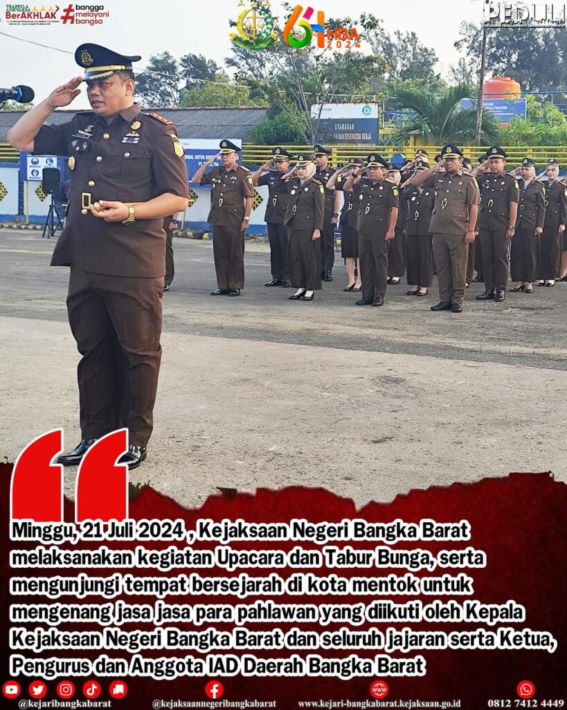 Minggu, 21 Juli 2024 , Kejaksaan Negeri Bangka Barat melaksanakan kegiatan Upacara dan Tabur Bunga, serta mengunjungi tempat bersejarah di kota mentok untuk mengenang jasa jasa para pahlawan yang diikuti oleh Kepala Kejaksaan Negeri Bangka Barat dan seluruh jajaran serta Ketua,