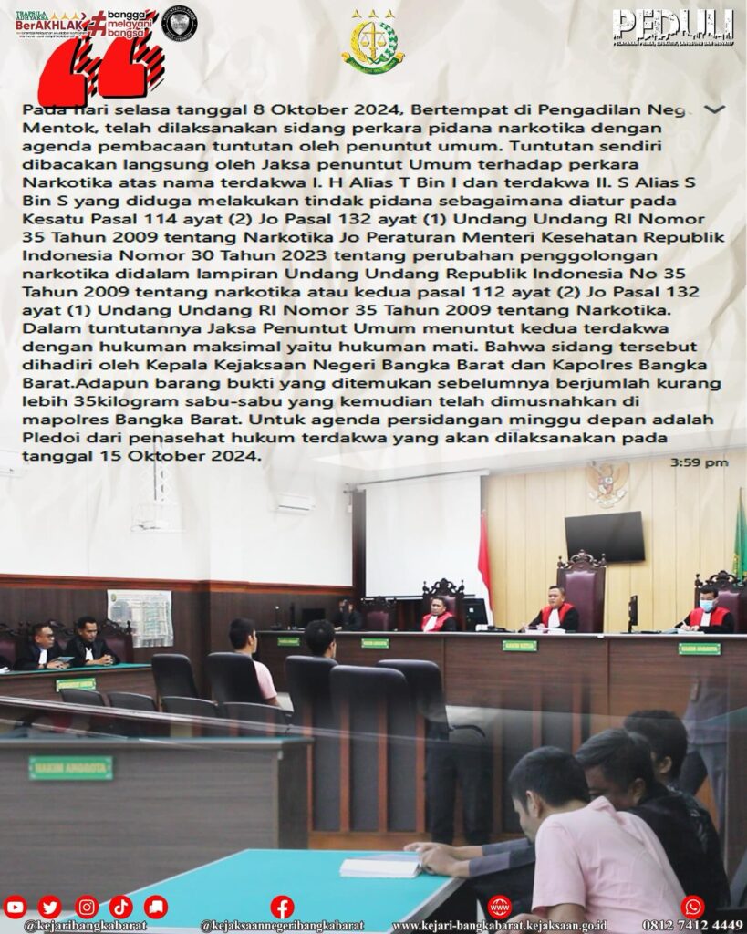 Pada hari selasa tanggal 8 Oktober 2024, Bertempat di Pengadilan Negeri Mentok, telah dilaksanakan sidang perkara pidana narkotika dengan agenda pembacaan tuntutan oleh penuntut umum. Tuntutan sendiri dibacakan langsung oleh Jaksa penuntut Umum terhadap perkara Narkotika atas nama terdakwa I. H Alias T Bin I dan terdakwa II. S Alias S Bin S yang diduga melakukan tindak pidana sebagaimana diatur pada Kesatu Pasal 114 ayat (2) Jo Pasal 132 ayat (1) Undang Undang RI Nomor 35 Tahun 2009 tentang Narkotika Jo Peraturan Menteri Kesehatan Republik Indonesia Nomor 30 Tahun 2023 tentang perubahan penggolongan narkotika didalam lampiran Undang Undang Republik Indonesia No 35 Tahun 2009 tentang narkotika atau kedua pasal 112 ayat (2) Jo Pasal 132 ayat (1) Undang Undang RI Nomor 35 Tahun 2009 tentang Narkotika. Dalam tuntutannya Jaksa Penuntut Umum menuntut kedua terdakwa dengan hukuman maksimal yaitu hukuman mati. Bahwa sidang tersebut dihadiri oleh Kepala Kejaksaan Negeri Bangka Barat dan Kapolres Bangka Barat.Adapun barang bukti yang ditemukan sebelumnya berjumlah kurang lebih 35kilogram sabu-sabu yang kemudian telah dimusnahkan di mapolres Bangka Barat. Untuk agenda persidangan minggu depan adalah Pledoi dari penasehat hukum terdakwa yang akan dilaksanakan pada tanggal 15 Oktober 2024.