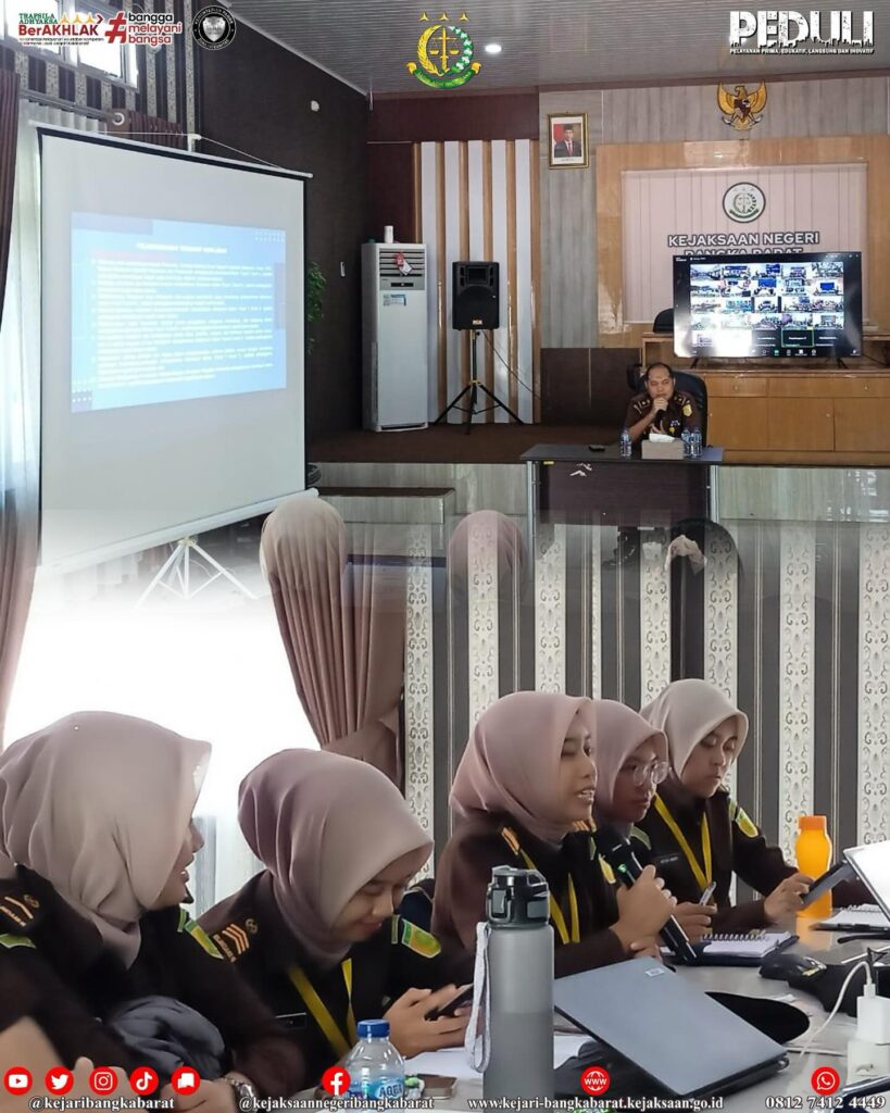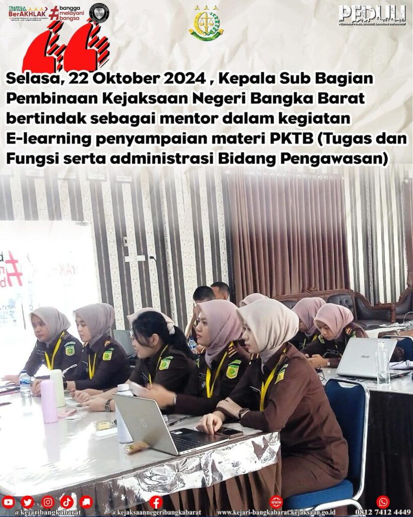 Selasa, 22 Oktober 2024 , Kepala Sub Bagian Pembinaan Kejaksaan Negeri Bangka Barat bertindak sebagai mentor dalam kegiatan E-learning penyampaian materi PKTB (Tugas dan Fungsi serta administrasi Bidang Pengawasan)