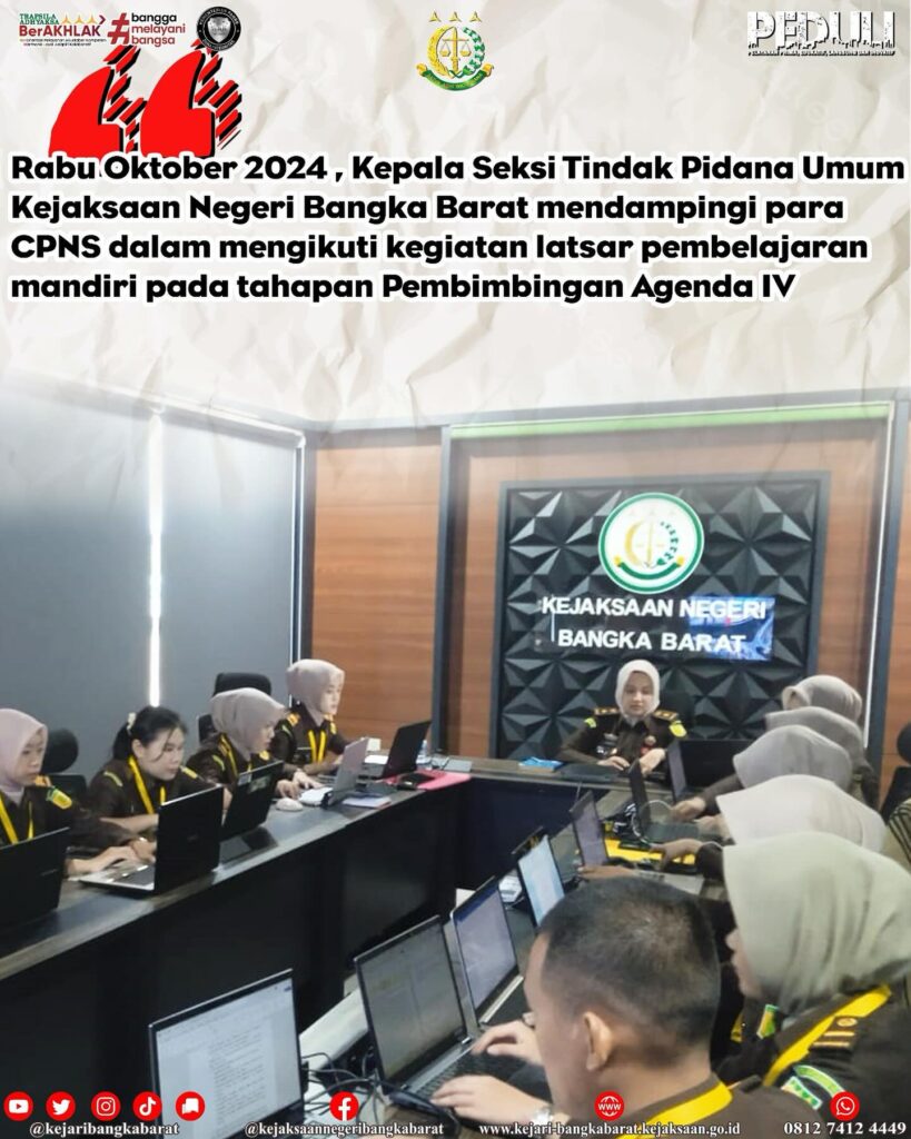 Rabu, 23 Oktober 2024 , Kepala Seksi Tindak Pidana Umum Kejaksaan Negeri Bangka Barat mendampingi para CPNS dalam mengikuti kegiatan latsar pembelajaran mandiri pada tahapan Pembimbingan Agenda IV