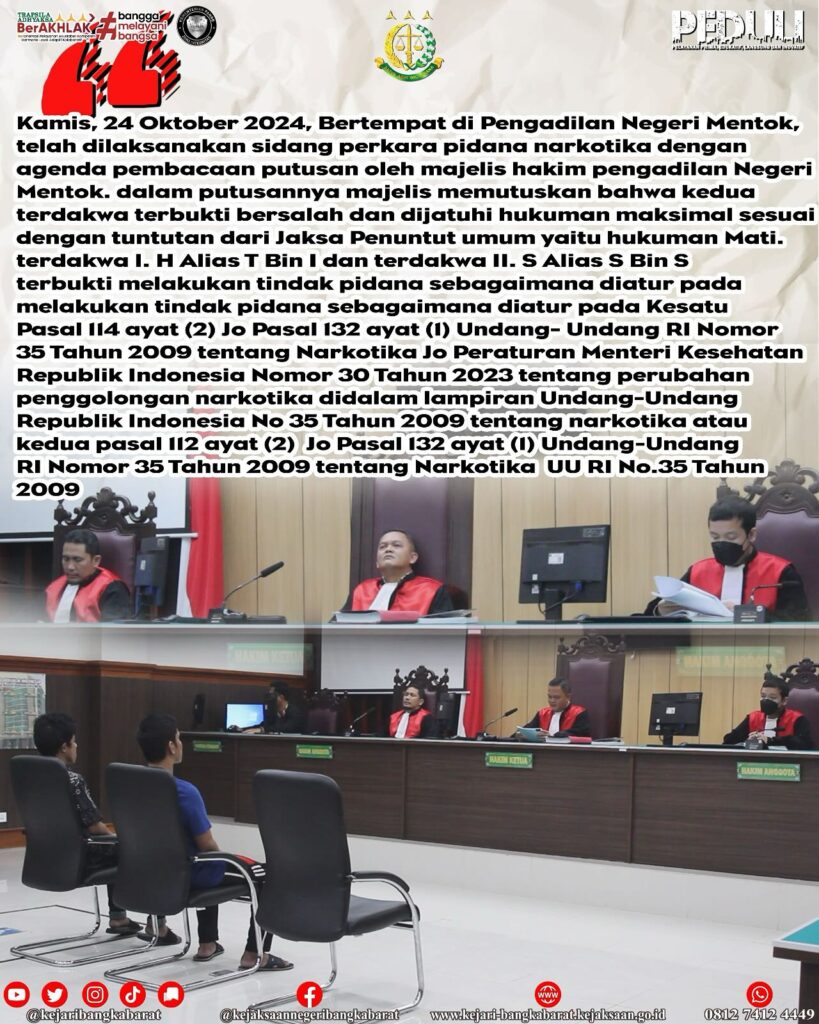 Kamis, 24 Oktober 2024, Bertempat di Pengadilan Negeri Mentok, telah dilaksanakan sidang perkara pidana narkotika dengan agenda pembacaan putusan oleh majelis hakim pengadilan Negeri Mentok. dalam putusannya majelis memutuskan bahwa kedua terdakwa terbukti bersalah dan dijatuhi hukuman maksimal sesuai dengan tuntutan dari Jaksa Penuntut umum yaitu hukuman Mati. terdakwa I. H Alias T Bin I dan terdakwa II. S Alias S Bin S terbukti melakukan tindak pidana sebagaimana diatur pada melakukan tindak pidana sebagaimana diatur pada Kesatu Pasal 114 ayat (2) Jo Pasal 132 ayat (1) Undang- Undang RI Nomor 35 Tahun 2009 tentang Narkotika Jo Peraturan Menteri Kesehatan Republik Indonesia Nomor 30 Tahun 2023 tentang perubahan penggolongan narkotika didalam lampiran Undang-Undang Republik Indonesia No 35 Tahun 2009 tentang narkotika atau kedua pasal 112 ayat (2) Jo Pasal 132 ayat (1) Undang-Undang RI Nomor 35 Tahun 2009 tentang Narkotika UU RI No.35 Tahun 2009