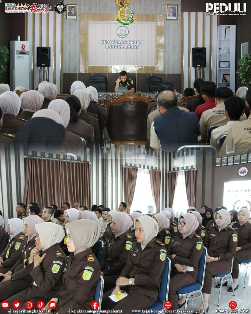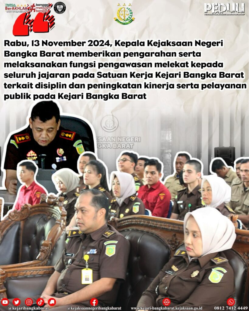 Rabu, 13 November 2024, Kepala Kejaksaan Negeri Bangka Barat memberikan pengarahan serta melaksanakan fungsi pengawasan melekat kepada seluruh jajaran pada Satuan Kerja Kejari Bangka Barat terkait disiplin dan peningkatan kinerja serta pelayanan publik pada Kejari Bangka Barat