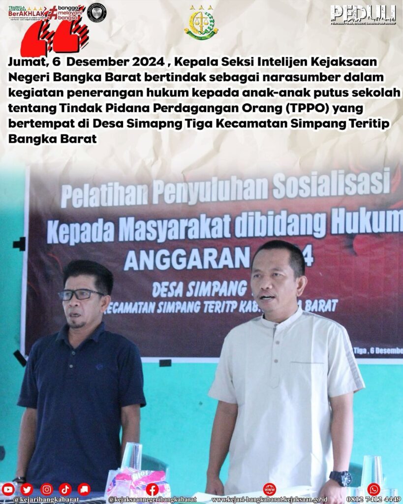Jumat, 6 Desember 2024 , Kepala Seksi Intelijen Kejaksaan Negeri Bangka Barat bertindak sebagai narasumber dalam kegiatan penerangan hukum kepada anak-anak putus sekolah tentang Tindak Pidana Perdagangan Orang (TPPO) yang bertempat di Desa Simapng Tiga KEcamatan Simpang Teritip Bangka Barat