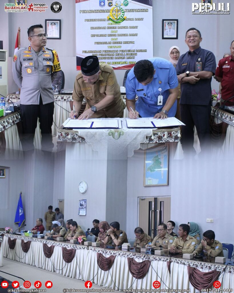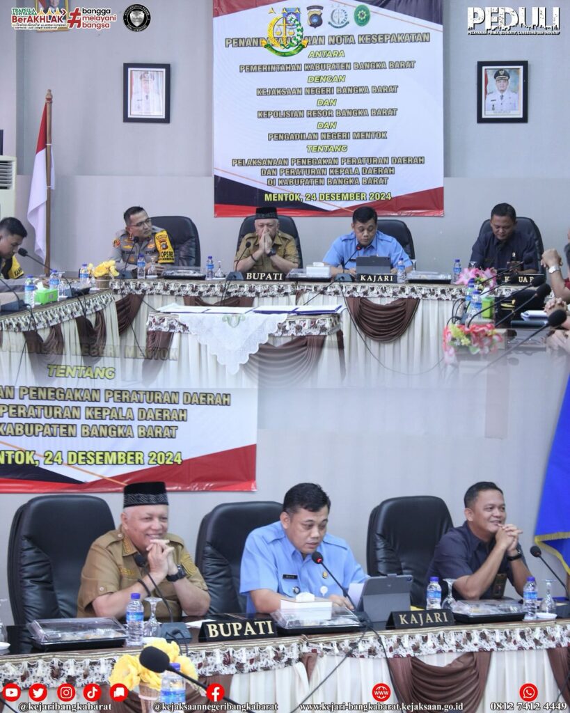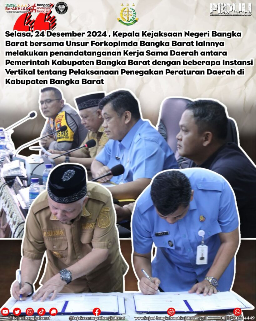 Selasa, 24 Desember 2024 , Kepala Kejaksaan Negeri Bangka Barat bersama Unsur Forkopimda Bangka Barat lainnya melakukan penandatanganan Kerja Sama Daerah antara Pemerintah Kabupaten Bangka Barat dengan beberapa Instansi Vertikal tentang Pelaksanaan Penegakan Peraturan Daerah di Kabupaten Bangka Barat