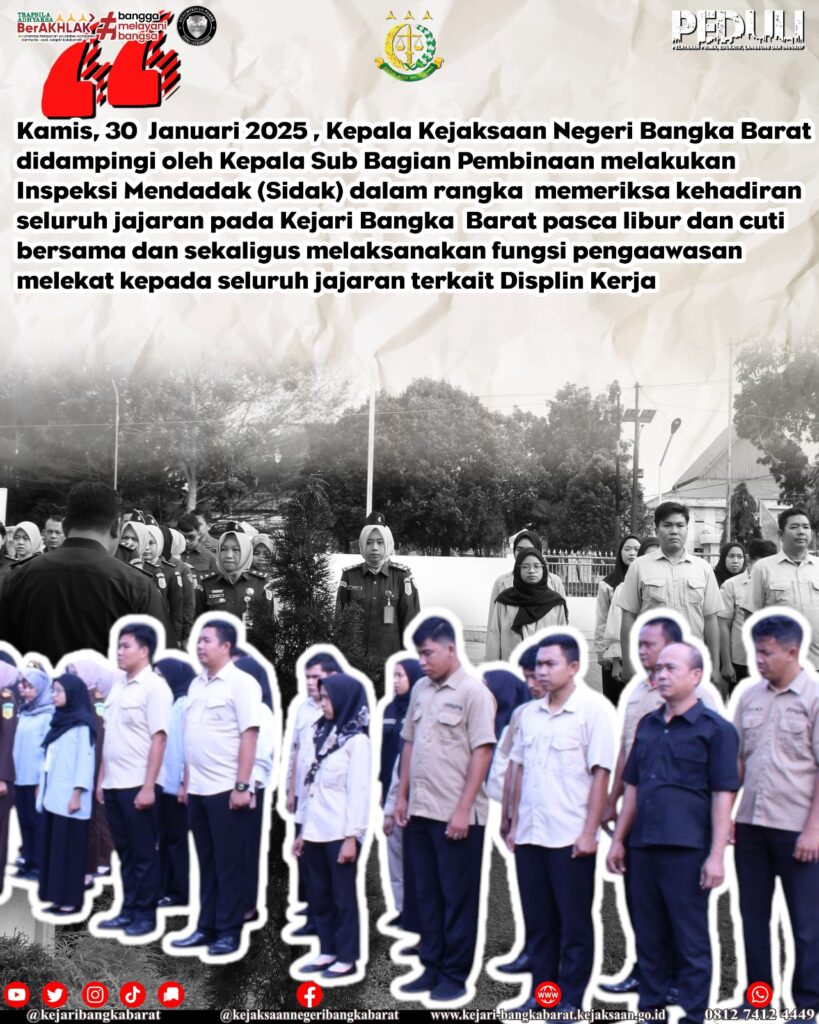Kamis, 30 Januari 2025 , Kepala Kejaksaan Negeri Bangka Barat didampingi oleh Kepala Sub Bagian Pembinaan melakukan Inspeksi Mendadak (Sidak) dalam rangka memeriksa kehadiran seluruh jajaran pada Kejari Bangka Barat pasca libur dan cuti bersama dan sekaligus melaksanakan fungsi pengaawasan melekat kepada seluruh jajaran terkait Displin Kerja