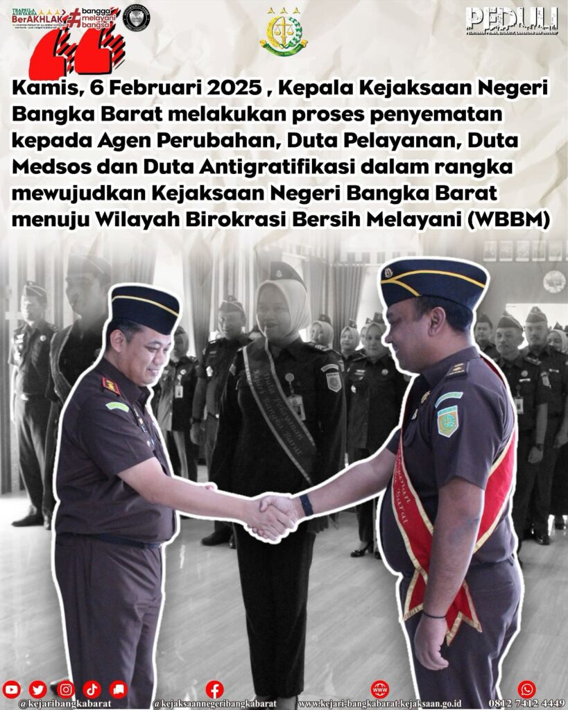 Kamis, 6 Februari 2025 , Kepala Kejaksaan Negeri Bangka Barat melakukan proses penyematan kepada Agen Perubahan, Duta Pelayanan, Duta Medsos dan Duta Antigratifikasi dalam rangka mewujudkan Kejaksaan Negeri Bangka Barat menuju Wilayah Birokrasi Bersih Melayani (WBBM)