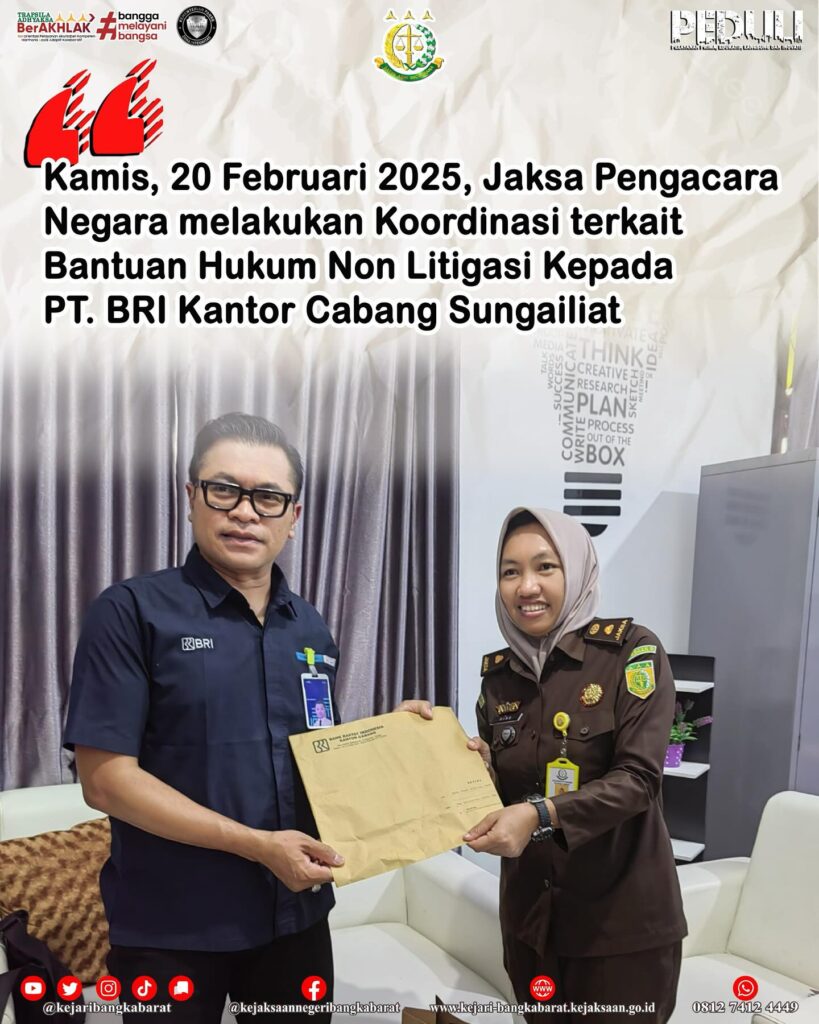 Berita Datun Koordinasi terkait Bantuan Hukum Non Litigasi 0 Kamis, 20 Februari 2025, Jaksa Pengacara Negara melakukan Koordinasi terkait Bantuan Hukum Non Litigasi Kepada PT. BRI Kantor Cabang Sungailiat Continue Reading Previous Monitoring terhadap kesiapan Pojok Restorative JusticeNext Monitoring kesiapan Pojok Restorative Justice dan Posko Pelayanan Hukum Kejari Bangka Barat Leave a Reply Cancel replyYour email address will not be published. Required fields are marked *Comment * Name * Email * Website Save my name, email, and website in this browser for the next time I comment.