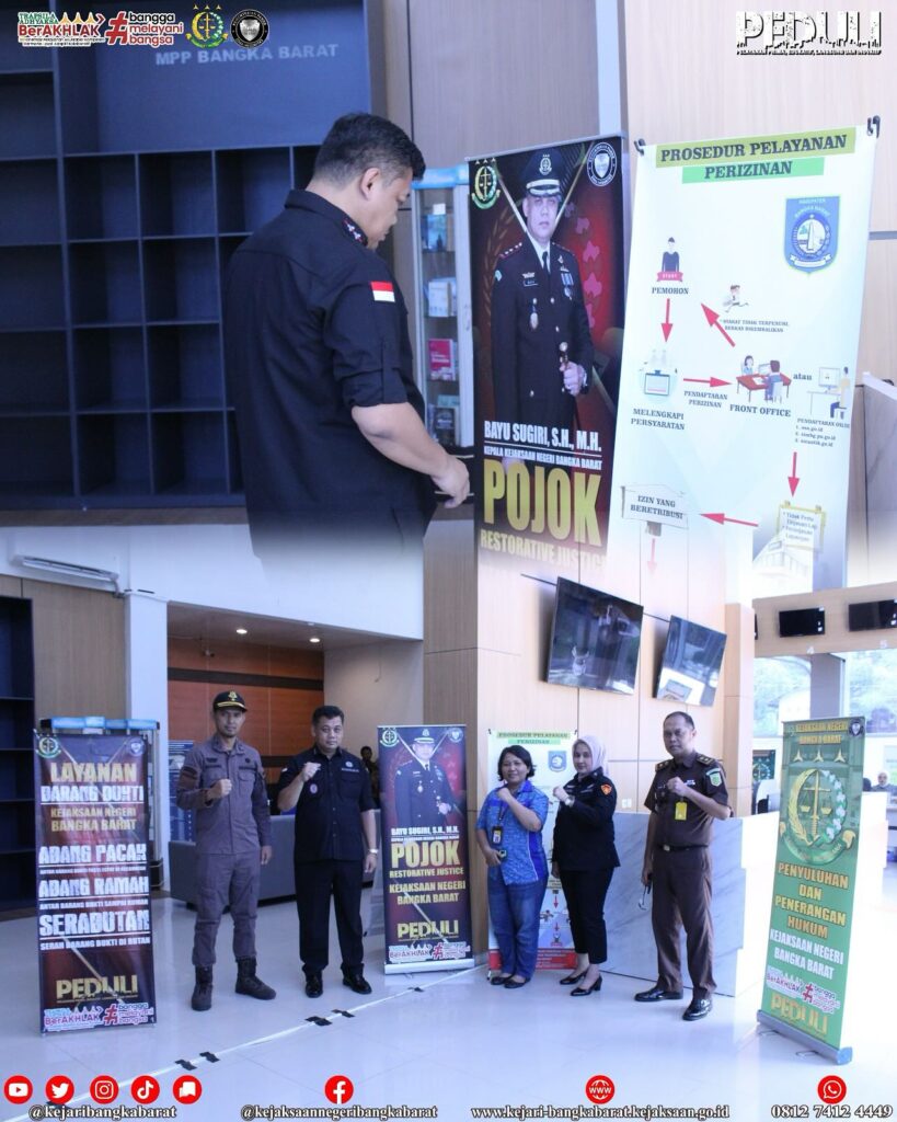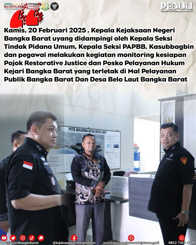 Kamis, 20 Februari 2025 , Kepala Kejaksaan NegeriBangka Barat uyang didampingi oleh Kepala Seksi Tindak Pidana Umum, Kepala Seksi PAPBB, Kasubbagbin dan pegawai melakukan kegiatan monitoring kesiapan Pojok Restorative Justice dan Posko Pelayanan Hukum Kejari Bangka Barat yang terletak di Mal Pelayanan Publik Bangka Barat Dan Desa Belo Laut Bangka Barat