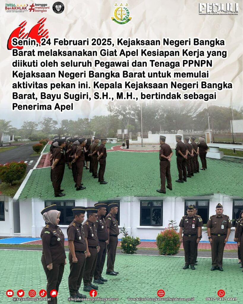 Senin, 24 Februari 2025 , Kejaksaan Negeri Bangka Barat melaksanakan Giat Apel Kesiapan Kerja yang diikuti oleh seluruh Pegawai dan Tenaga PPNPN Kejaksaan Negeri Bangka Barat untuk memulai aktivitas pekan ini. Kepala Kejaksaan Negeri Bangka Barat, Bayu Sugiri, S.H., M.H. bertindak sebagai Penerima Apel