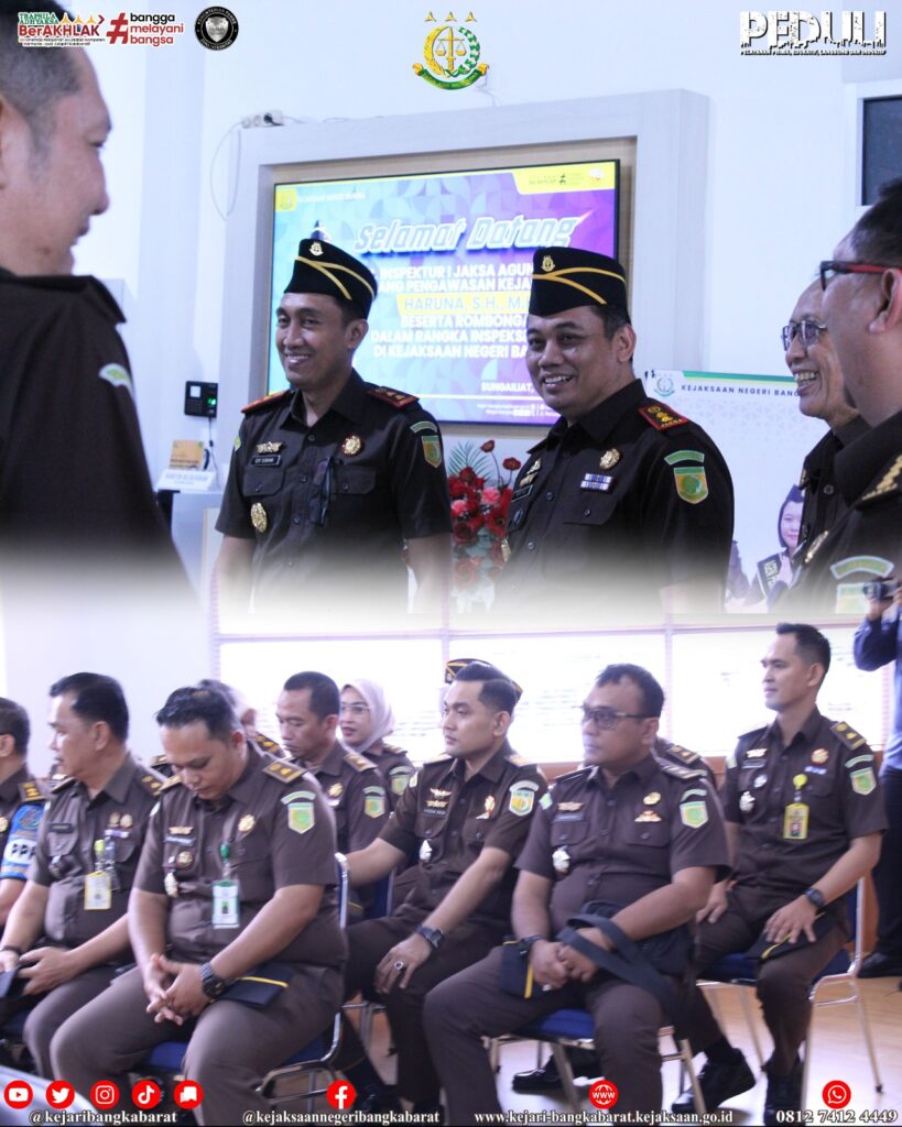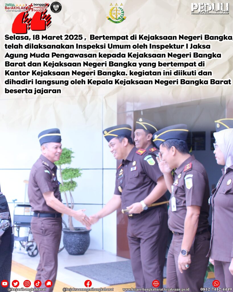 Selasa, 18 Maret 2025 , Bertempat di Kejaksaan Negeri Bangka, telah dilaksanakan Inspeksi Umum oleh Inspektur I Jaksa Agung Muda Pengawasan kepada Kejaksaan Negeri Bangka Barat dan Kejaksaan Negeri Bangka yang bertempat di Kantor Kejaksaan Negeri Bangka. kegiatan ini diikuti dan dihadiri langsung oleh Kepala Kejaksaan Negeri Bangka Barat beserta jajaran