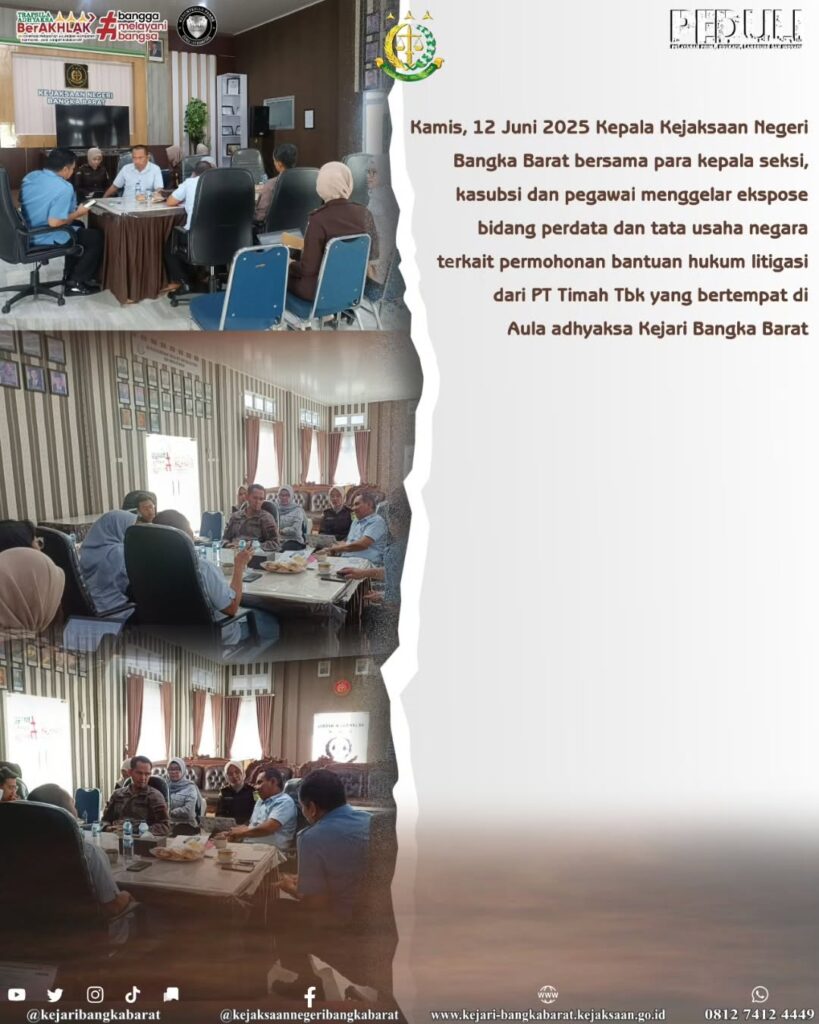 Kamis, 12 Juni 2025 Kepala Kejaksaan Negeri Bangka Barat bersama para kepala seksi, kasubsi dan pegawai menggelar ekspose bidang perdata dan tata usaha negara terkait permohonan bantuan hukum litigasi dari PT Timah Tbk yang bertempat di Aula adhyaksa Kejari Bangka Barat