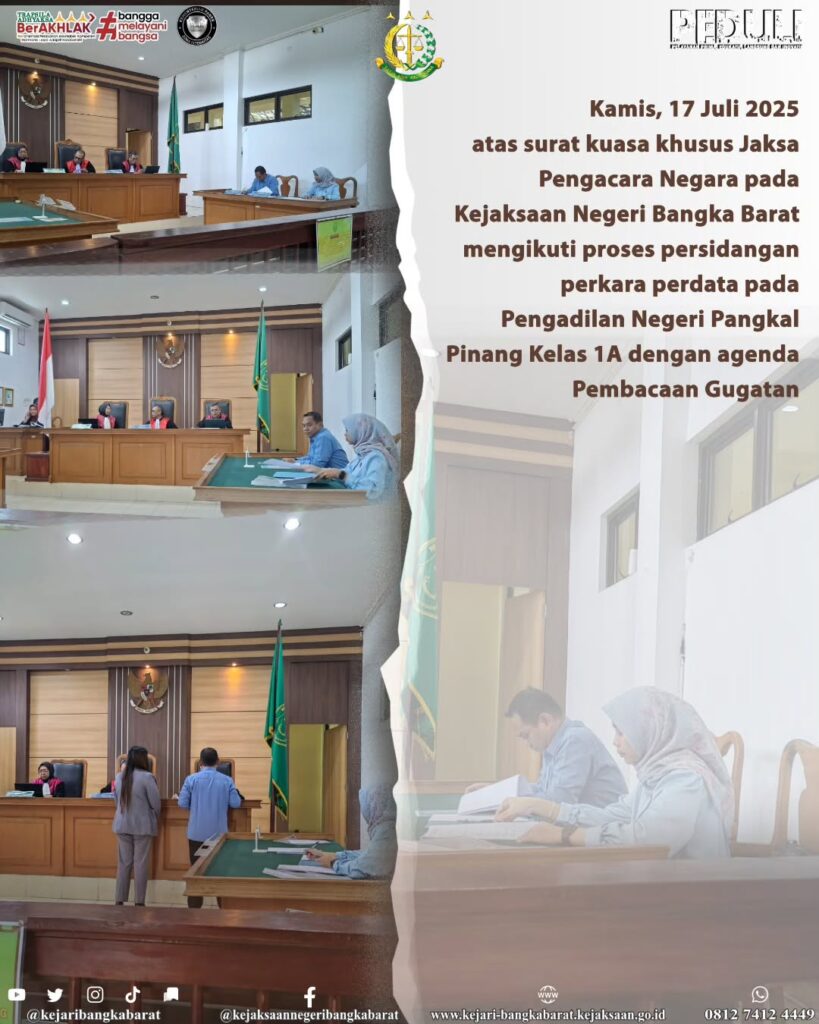 Kamis, 17 Juli 2025 atas surat kuasa khusus Jaksa Pengacara Negara pada Kejaksaan Negeri Bangka Barat mengikuti proses persidangan perkara perdata pada Pengadilan Negeri Pangkal Pinang Kelas 1A dengan agenda Pembacaan Gugatan
